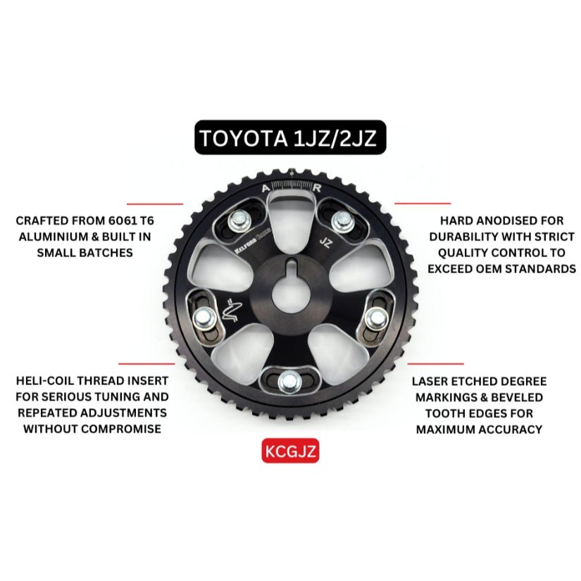 Toyota 1JZ / 2JZ Cam gears have been CNC machined from highest quality 6061 T6 aluminium to more precise tolerances than original OEM gears. The tooth edges have been bevelled to increase belt life and then hard anodised to ensure strength and longevity. Precise degree markings are then laser etched onto the cam gear to assist in the tuning of engines. To finish we have used high quality fasteners and a heli-coil thread insert in the ring gear to allow enough torque to be applied while tightening fasteners. They can be adjusted multiple times with confidence that the threads will not stretch or fatigue.