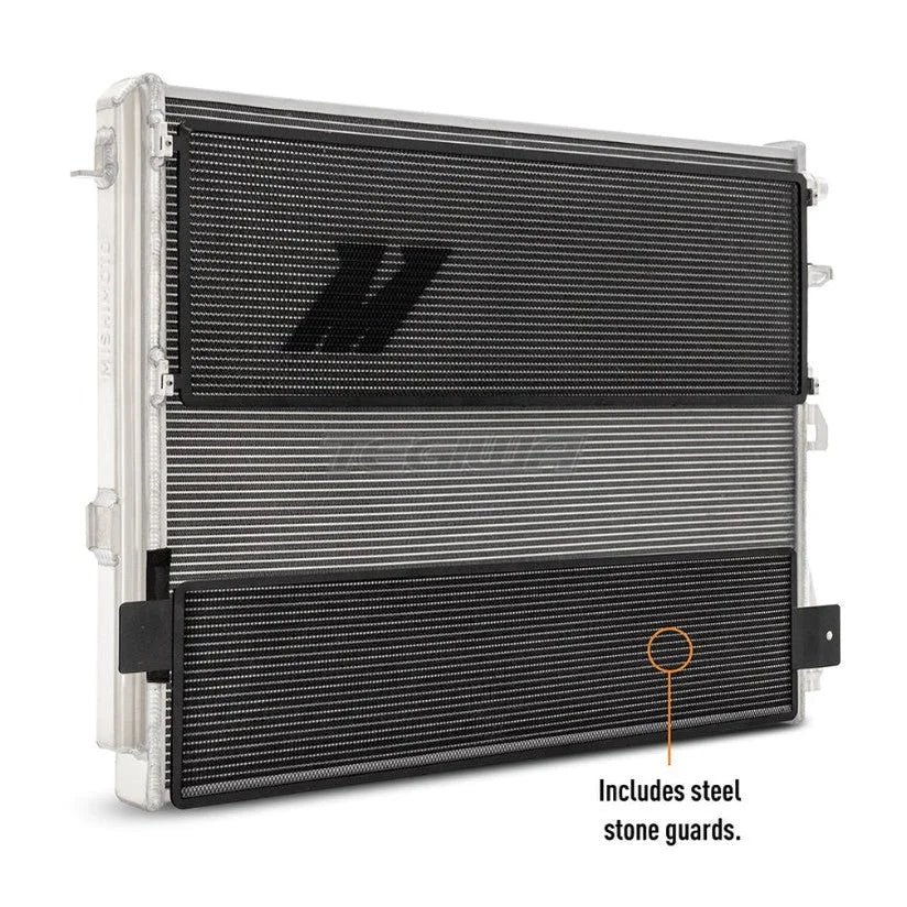 Introducing the Mishimoto 2021+ BMW G8X M3/M4 performance heat exchanger, the ultimate solution to keep your charge air cool under the most demanding conditions. In the world of forced induction vehicles, air-to-water intercooling is the future, and Mishimoto are taking it to the next level.—-We started from scratch, leaving no room for compromise. Our design eliminates all plastic components, replacing them with durable aluminum end tanks, core, and CNC-machined ports. TIG-welded for maximum strength and longevity, this heat exchanger will withstand even the harshest conditions. We took it further by incorporating strutted tubes within the core, adding unparalleled resistance against bowing and flexing during aggressive cornering.—-But strength is not our only focus. We’ve increased the core volume by 23 percent and expanded the external fin surface area by 44 percent. Combined with our dual-pass flow configuration and louvered fin design, this performance heat exchanger vastly improves cooling capacity over stock, enhancing overall performance.—-Rest assured, the Mishimoto Performance Heat Exchanger for the 2021+ BMW G8X M3/M4 is designed to fit perfectly with all other factory components, ensuring seamless integration into your vehicle. For added protection, we include steel rock guards to shield the heat exchanger from debris and prevent punctured tubes or crushed fins. The Mishimoto G8X M3/M4 performance heat exchanger fits both automatic and manual transmissions.—-The Mishimoto 2021+ BMW G8X M3/M4 performance heat exchanger comes with our renowned Mishimoto Lifetime Warranty, giving you peace of mind and confidence in your investment. Upgrade your BMW G8X M3/M4 with the Mishimoto Heat Exchanger and experience the true power of cooling efficiency.